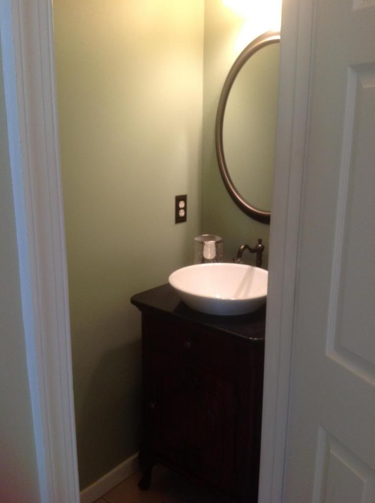 The downstairs bathroom was quite shocking as well in it's rich gold/caramel color with the sponging over top. We chose to tone that down using the Salisbury Green.