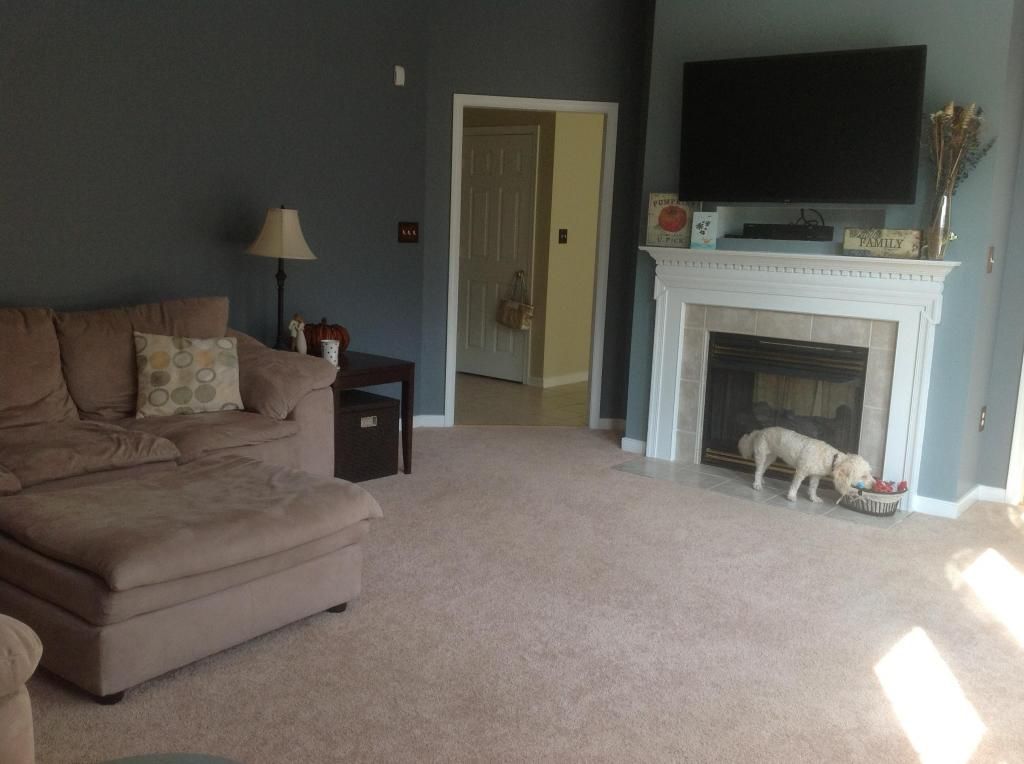 One of the next biggest transformations was the family room. It was a dark gold/caramel color and just a little harsh feeling. Not the cozy, relaxing feel they were looking for. They originally wanted a neutral but once I showed them this darker blue, they fell in love!